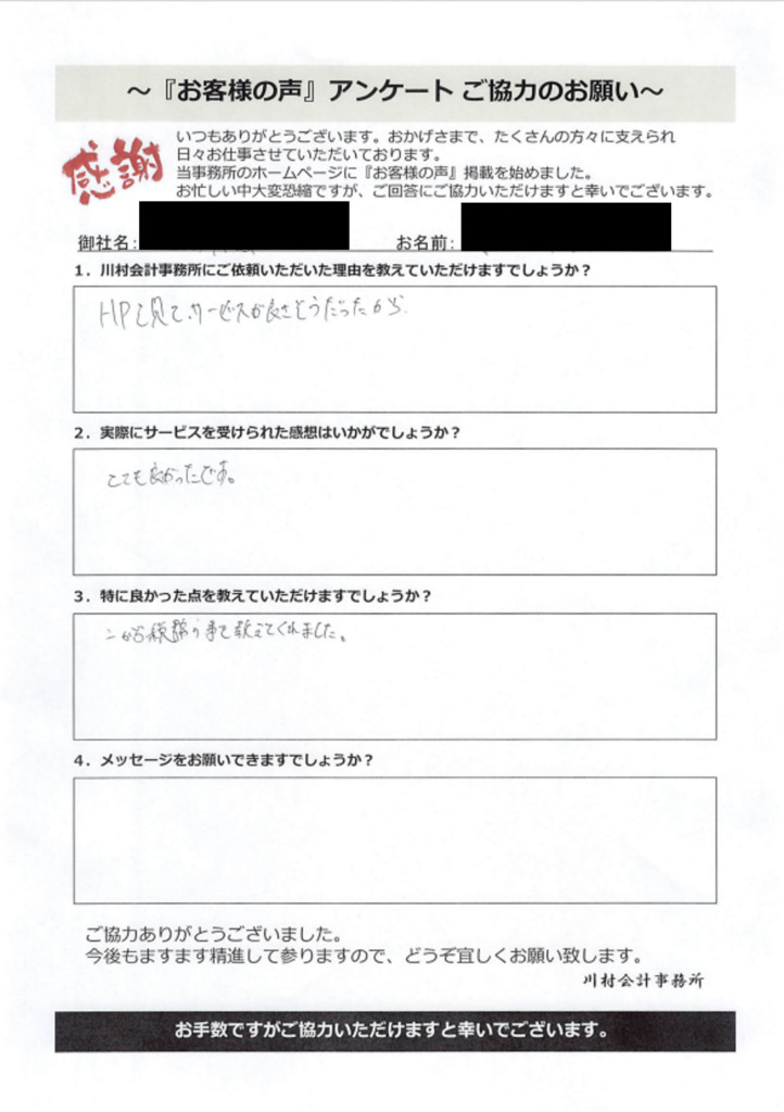 お客様の声「(税務調査)対応が早く、親切に対応していただきました」