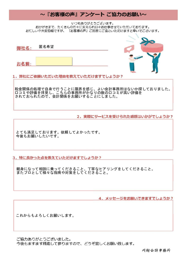 川村会計事務所にご依頼いただいた理由を教えていただけますでしょうか?